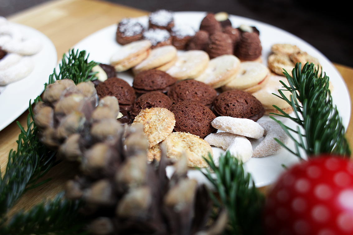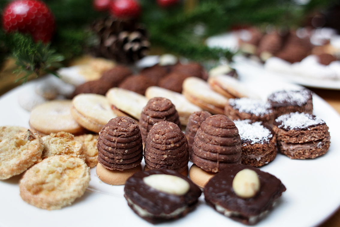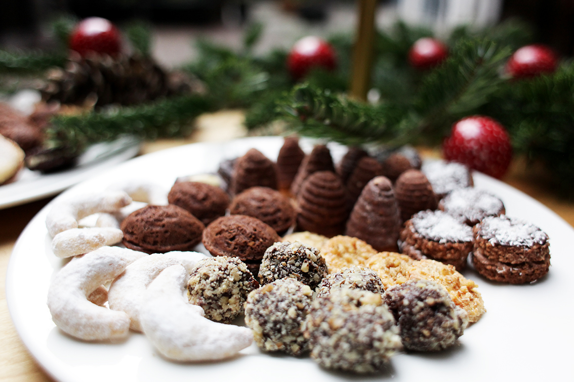 vanilkové rohlíčky, linecká kolečka, vosí hnízda, střapáče, plněné ořechy, išilské cukroví, čokoládové kuličky obalované ve vlašském ořechu, kokosová kolečka